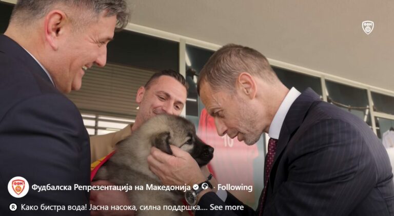 Претседателот на УЕФА, Чеферин, доби шарпланинец од ФФМ како подарок при посетата на Македонија