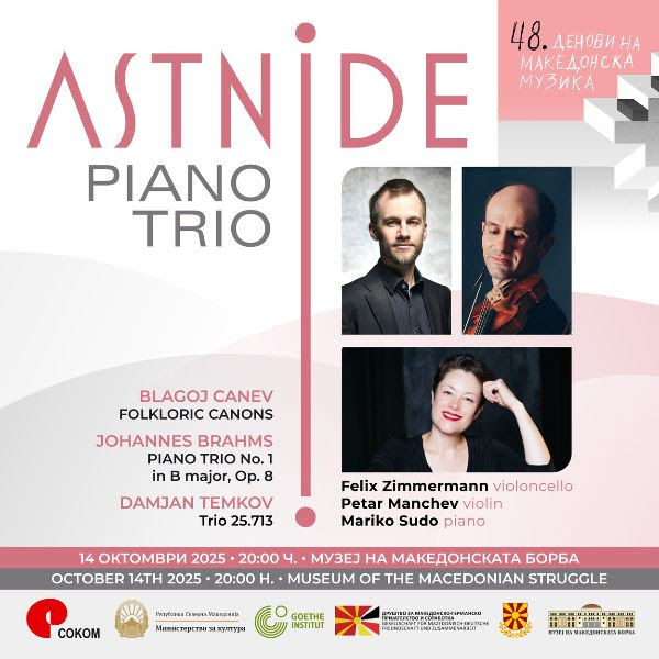 Во вторник, на 14 октомври 2025, 20 часот во Музеј на македонската борба ќе се одржи концерт на Концерт на пијано триото АСТНИДЕ од Германија. На репертоарот се дела на Благој Цанев: ФОЛКЛОРНИ НАПЕВИ за виолина, виолончело и пијано, Јоханес Брамс: КЛАВИРСКО ТРИО бр.1, оп.8, Дамјан Темков 25.713, а ќе настапат Петар Манчев – виолина, Феликс Цимерман – виолончело и Марико Судо – пијано