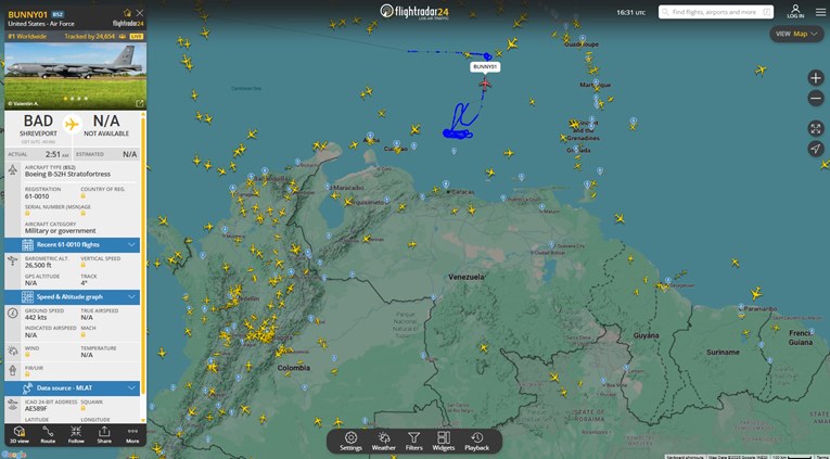 Според податоците од платформата FlightRadar, леталата се движеле во зоната над островите Ла Орчила и Гран Роке, каде што Венецуела има воена инфраструктура. Неколкупати исчезнале од цивилниот радар, за потоа повторно да се појават — што, според воените аналитичари, е јасен сигнал за намерна демонстрација на сила.