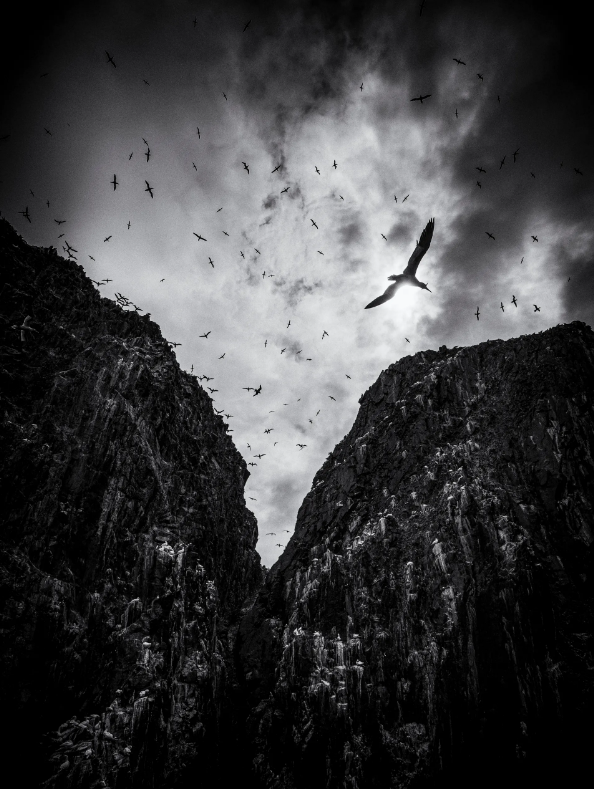 „Ја снимив оваа слика од патување со брод до Бас Рок, гледајќи во високите карпи и ганетите кои се издигнуваат над неа. Сакав да ја прикажам драмата на местото, па го претворив во црно-бело и ја затемни сликата. Имав доволно среќа да слетам на островот неколку дена претходно и можев одблиску да ја фотографирам оваа огромна популација на ганети кои се размножуваат, кои беа целосно уништени оваа година од птичјиот грип што го погоди островот“.