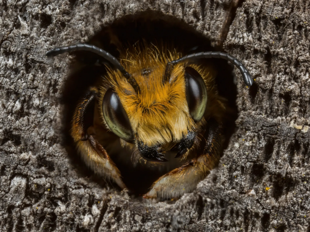 „Имам посебен интерес за осамените пчели во Британија и сакам да ги фотографирам видовите што ја посетуваат нашата градина во Стафордшир. Ја видов оваа машка пчела листопарка на Вилугби како гледа надвор од дупката, но таа се повлекуваше секогаш кога ќе се приближев. Тие често паузираат за да се загреат на влезот пред да полетаат, па јас чекав, камерата подготвена за вистинскиот момент. На крајот повторно се појави и јас внимателно го снимав кадарот. Во последен момент ја наведна главата на едната страна до она што го чувствував како пријатен агол“