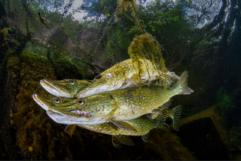 „Оваа фотографија е направена на нуркање со цел да се најде штука за размножување во каменолом. Наидов на група од шест штуки, од кои две се оддалечија, оставајќи ја оваа група од четири – три мажјаци и една женка (најдалеку од погледот). За време на додворувањето, мажјаците не забораваат на нуркачите, па можеше да им се доближи и да направи серија фотографии“.