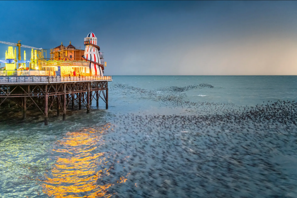 – Секоја вечер од зимата, Брајтон е сведок на спектакуларното мрморење на птиците. Во оваа конкретна вечер, невремето што се приближуваше го осветлуваше хоризонтот, а како што се намалуваше светлина, така небото се балансираше со светлата на засолништето кое што се наоѓаше на самото пристаниште. „Се префрлив на широкоаголен објектив, со намера засолништето и неговиот одраз да бидат дел од мојата фотогија и така го чекав правиот момент.  Како пристигнуваа птиците, така создаваја грациозни, елегантни облини низ мојот визир. Особено ми се допаѓа обликот на нивното движење на оваа фотографија“