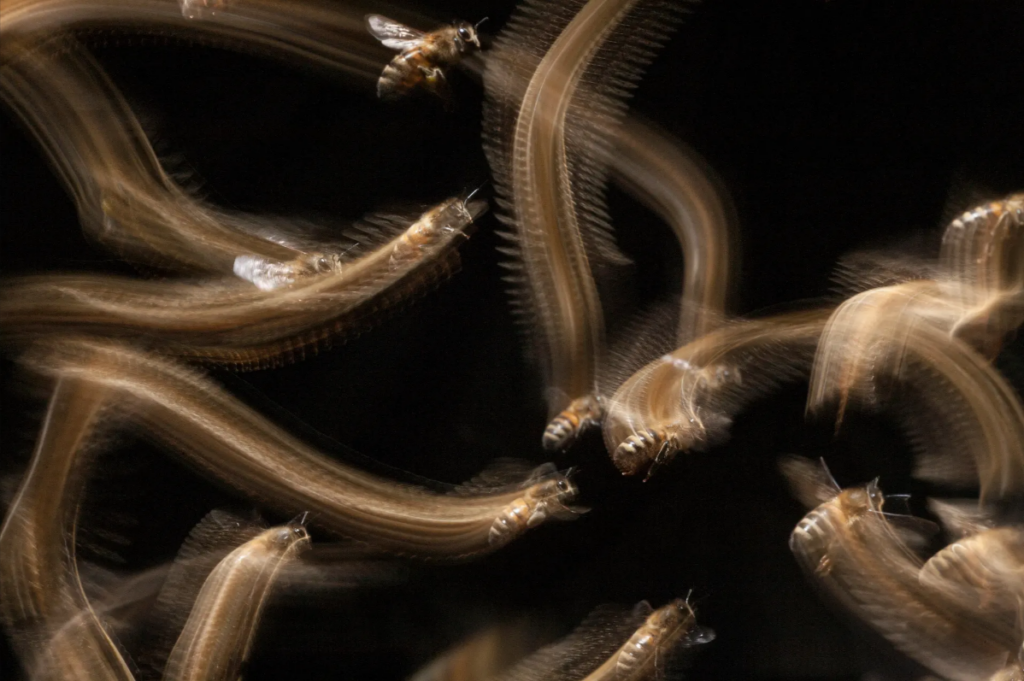 – „Фотографијата е направена за време на карантинот,  во мал див свет во градина во Бристол, каде што мој пријател чува  пчели. Поминав многу време гледајќи ги пчелите, обидувајќи се да откријам како можам да ги покажам нивните доаѓања и заминувања во кошницата на начин што ќе го пренесе чувството на движење и ќе ја прикаже нивната зафатеност. Користев бавна брзина на блендата и втор блиц за да ги замрзнам пчелите откако ги направија своите светлосни траги“.
