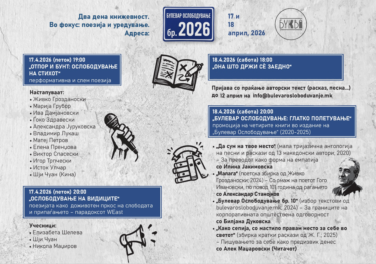 Дводневна книжевна програма под наслов „Булевар Ослободување бр. 2026“ ќе се одржи на 17 и 18 април во новата „Буква“, на аголот од улицата Рузвелтова и булеварот „Теодосиј Гологанов“ во Скопје.