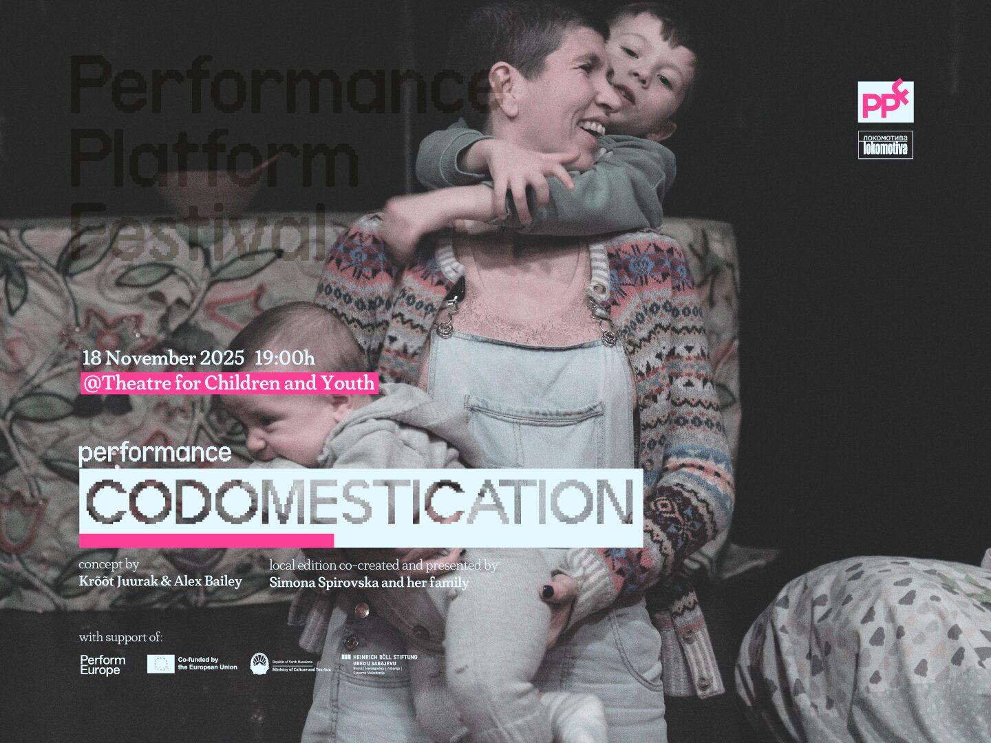Есенското издание на Перформанс Платформа фестивал 2025 се затвора со CODOMESTICATION, уникатно дело што ја преиспитува врската меѓу уметноста, грижата и секојдневниот живот. Создаден првично од уметничкиот дуо Крот Јурак и Алекс Бејли заедно со нивното дете, перформансот денес се претставува преку локални адаптации како дел од турнејскиот концепт showing without going во рамки на проектот (M)others on Tour.
