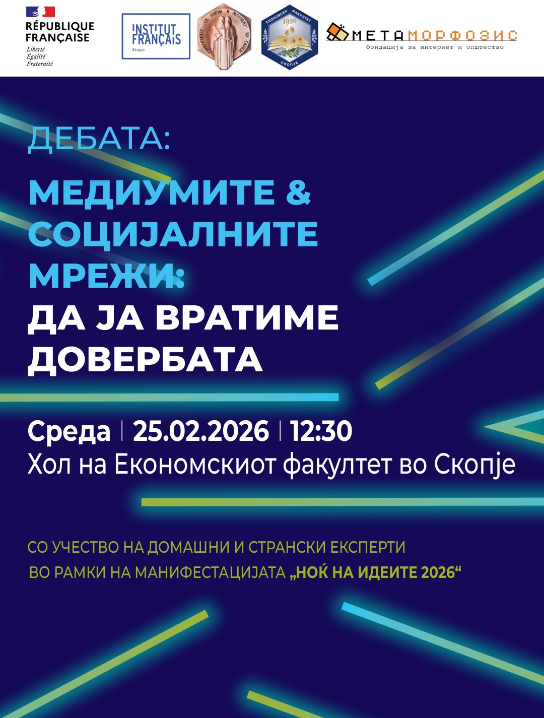 Францускиот институт во Скопје, фондацијата Метаморфозис и Економскиот факултет во Скопјеи организираат дебата насловена „Медиумите и социјалните мрежи: да ја вратиме довербата”, која ќе се одржи во среда, 25 февруари 2026 година, со почеток во 12:30 часот, во Холот на Економскиот факултет во Скопје, во рамките на 11. издание на меѓународната манифестација „Ноќ на идеите”.