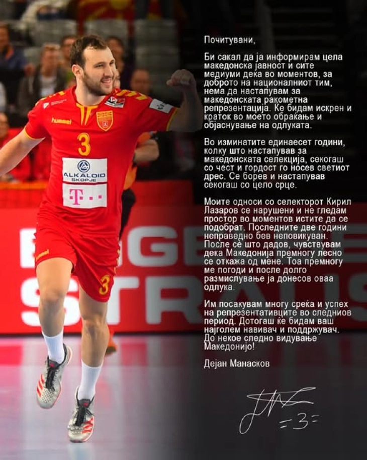 „Почитувани, Би сакал да ја информирам цела македонска јавност и сите медиуми дека во моментов, за доброто на националниот тим, нема да настапувам за македонската ракометна репрезентација. Ќе бидам искрен и краток во моето обраќање и објаснување на одлуката. Во изминатите единаесет години, колку што настапував за македонската селекција, секогаш со чест и гордост го носев светиот дрес.