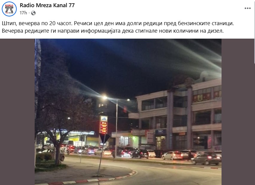 Слични информации се појавија и на социјалните мрежи. Во објава на Радио Мрежа Канал 77 се тврди дека во Штип „речиси цел ден има долги редици пред бензинските станици“, а вечерта редиците дополнително се зголемиле откако стигнале нови количини дизел.