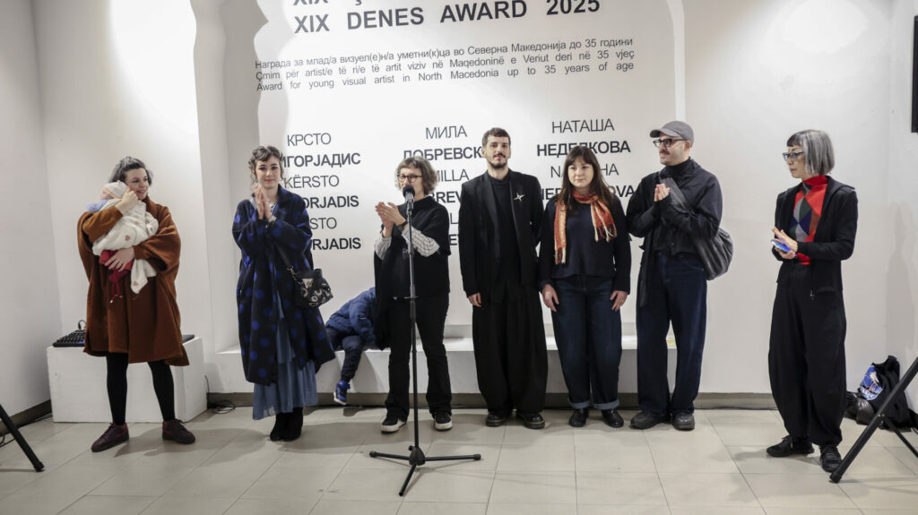 Со ДЕНЕС наградата одбележуваме и мал јубилеј, односно 10 години од кога ние од организацијата Факултет за работи што не се учат – ФРУ, почнавме да ја организираме оваа единствена награда од овој вид во земјава, награда за млад/а визуел(е)н/а уметни(к)чка во земјава до 35 години, и од тогаш особено ми е драго дека успеавме наградата да ја издигнеме до постулатите кон кои се приклонуваме – заедничко учење и работење, предизвикувајќи го индивидуалниот и компетитивен пристап, продуцирајќи ја наградата колаборативно и вложувајќи продукциски услови за младите, но и овозможувајќи им на финалистите не само средби и презентации со интернационално жири и продукција на ново дело, туку и други награди. Па така, добитникот/добитничката на наградата „ДЕНЕС“ 2025 добива двомесечен престој во Residency Unlimited во Њујорк во 2026 година, додека останатите двајца уметници – финалисти оваа година добиваат едномесечен престој во Галеријата „Простор“ на организацијата „Културен хаб Хрватска“ во Сплит во 2026 година и самостојна изложба во просторот и самостојна изложба во Скопје во 2026 година.
