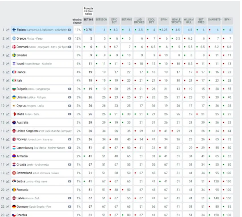 Финска, според тековните прогнози, е на врвот на листата фаворити за оваа година, додека Грција и Данска следат веднаш зад неа. Ако предвидувањата се остварат, Финска би можела да го повтори успехот од 2006 година, кога победи со песната „Hard Rock Hallelujah“.