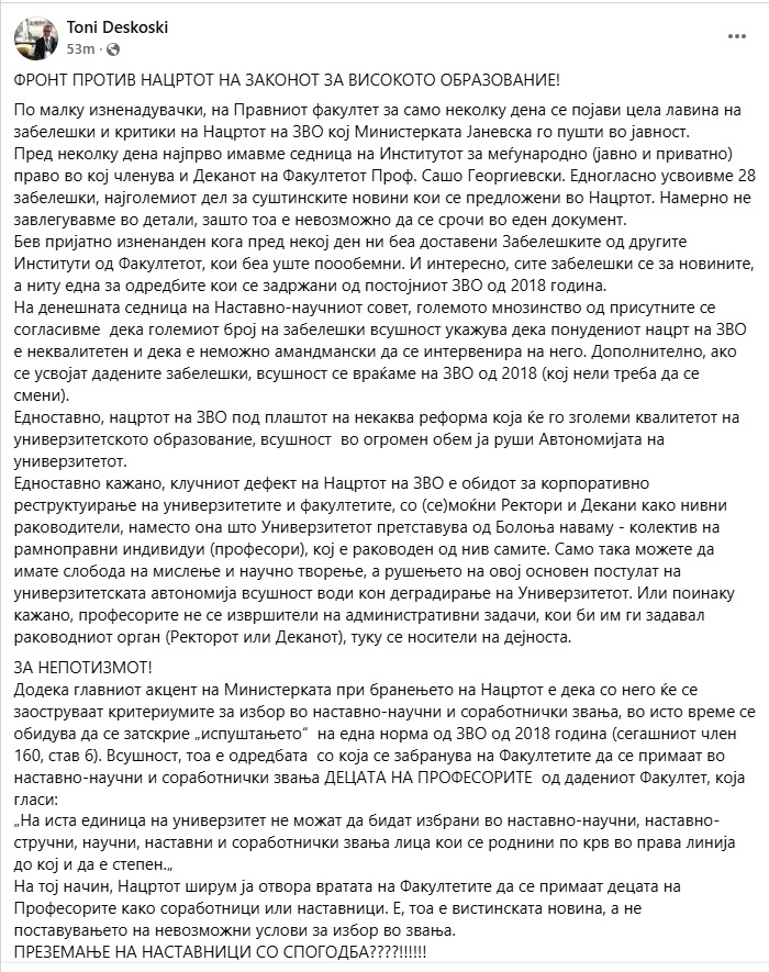 „По малку изненадувачки, на Правниот факултет за само неколку дена се појави цела лавина на забелешки и критики на Нацртот на ЗВО кој Министерката Јаневска го пушти во јавност.