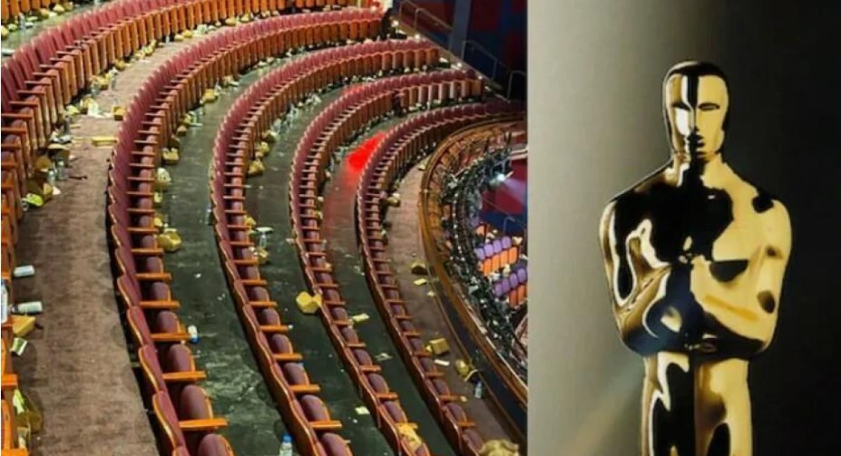 На фотографијата, направена во театарот „Долби“, се забележуваат шишиња вода, пакувања од храна, кутии од пуканки и други отпадоци расфрлани низ седиштата и подот. Сцената е во целосен контраст со гламурот што се прикажува за време на самата церемонија.