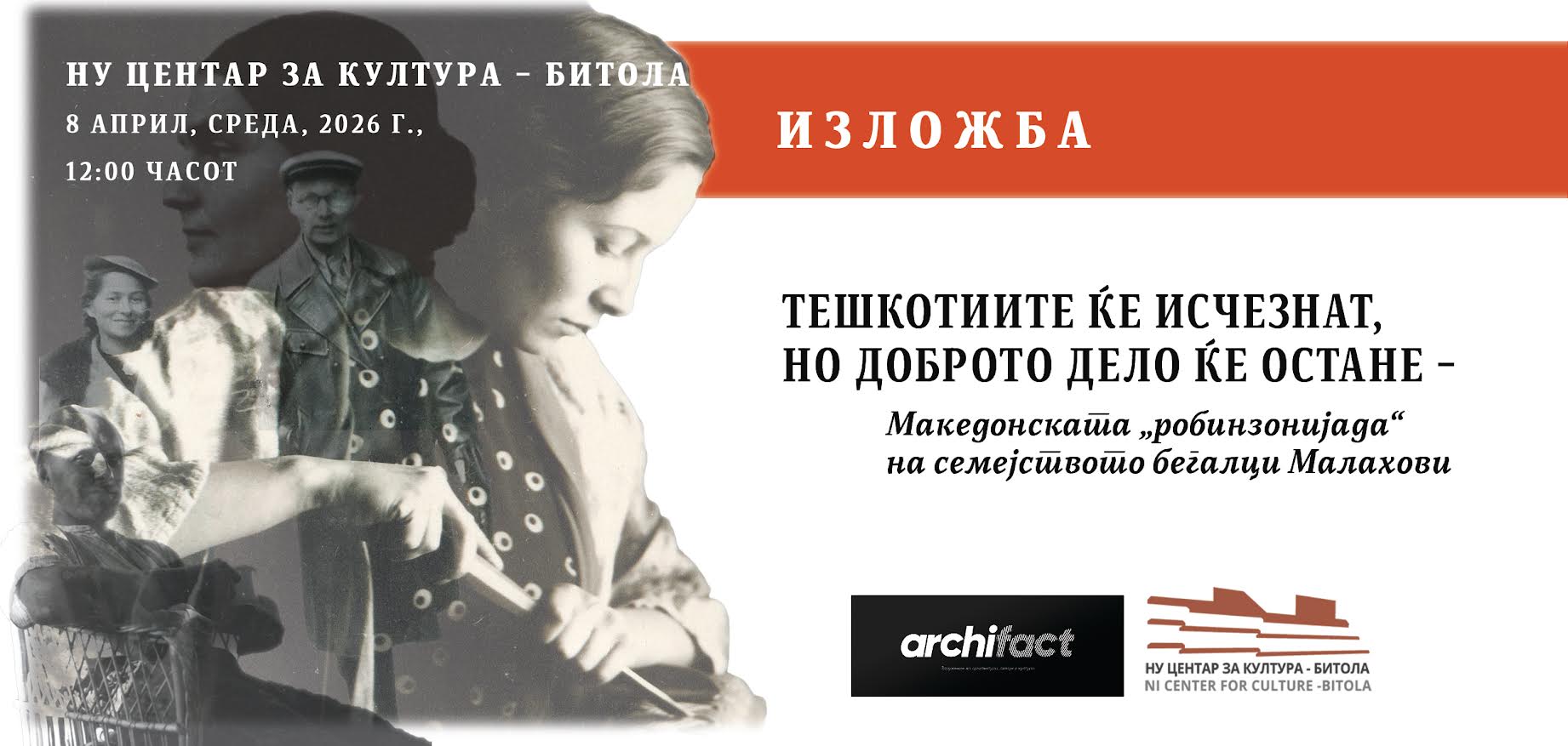 На 8 април (среда) во 12:00 часот во изложбениот салон на Центарот за култура во Битола, ќе се одржи отварањето на изложбата „Тешкотиите ќе исчезнат, но доброто дело ќе остане – Македонската ‘робинзонијада’ на семејството бегалци Малахови“.