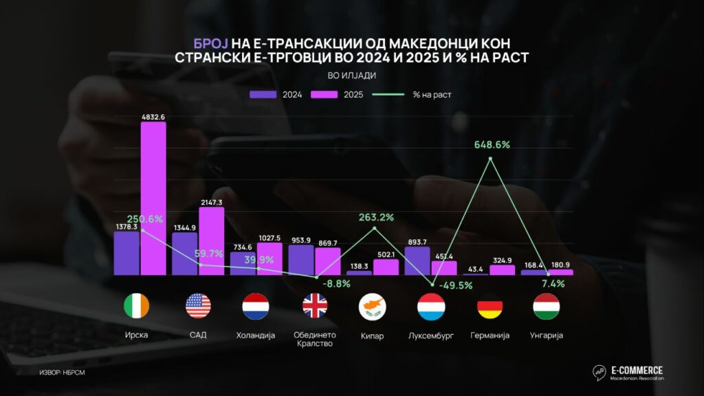 Најголема вредност на е-трансакциите е остварена во Ирска во износ од 92,1 милиони евра. Оваа земја бележи раст од 173 отсто во вредноста на трансакциите во однос на претходната година. Претседателката на Асоцијацијата за е-трговија, д-р Нина Ангеловска Станков, појаснува дека таму се лоцирани европските операции на компании како Amazon, Google и Meta. Веднаш по неа е Холандија со 62,4 милиони евра како центар за Booking.com и логистичките хабови.
