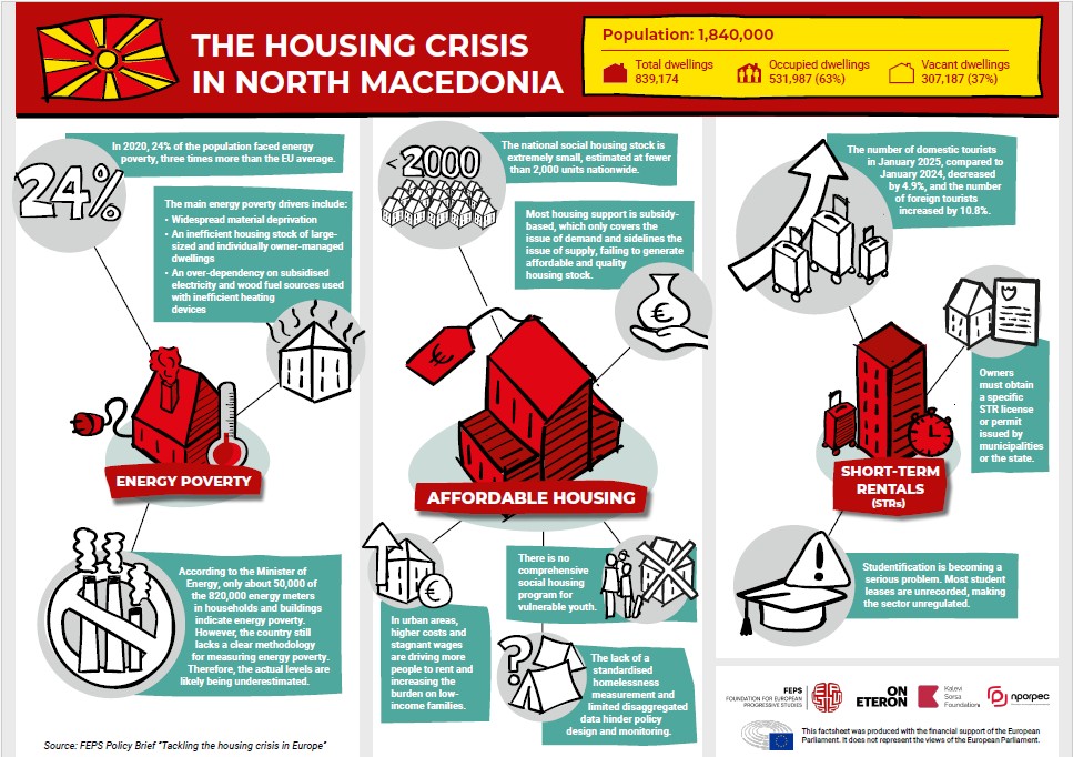 Иако Северна Македонија не е членка на Европската Унија, анализата покажува дека истите структурни притисоци се присутни и кај нас: раст на трошоците за живот, слаб развој на социјалното домување, висока енергетска сиромаштија и дополнителни притисоци од туризмот и пазарните шокови. Дополнителен проблем е недостигот од стандардизирани податоци за бездомништвото и енергетската сиромаштија, што ја отежнува изработката на јавни политики засновани на докази.