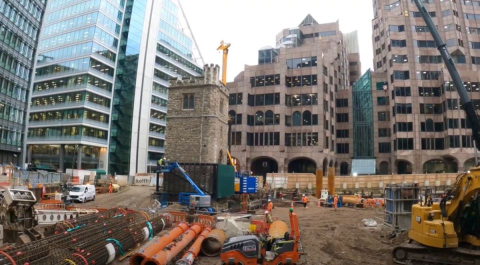 Средновековна црковна кула е подигната 14 метри над земјата за да се направи место за канцелариска кула од 60.387 квадратни метри во Лондон Сити.