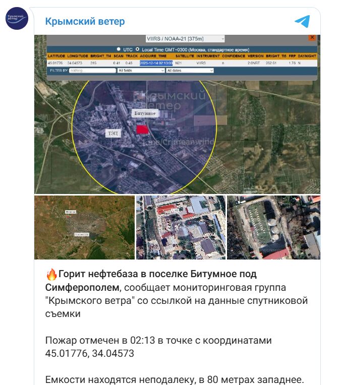 Паднати остатоци од дрон предизвикале пожар во една куќа, оштетиле уште четири објекти, урнале далекувод и оставиле цело село без електрична енергија. Одделен удар со дрон предизвикал пожар и во нафтено складиште на анектираниот Крим, во селото Битумне, во близина на Симферопол, што го потврдуваат и сателитските снимки објавени од надзорниот канал „Кримски ветер“.