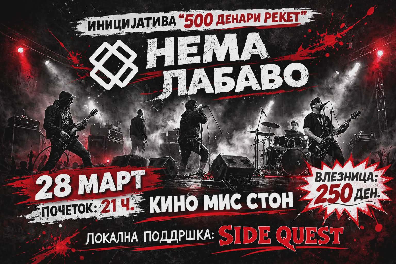 Независната културна сцена во Прилеп продолжува со нов настан. Иницијативата „500 денари рекет“ на 28 март 2026 година организира концерт во кино салата „Мис Стон“, каде пред прилепската публика ќе настапи скопскиот панк рок и инди рок бенд „Нема лабаво“, а локална поддршка ќе даде прилепскиот бенд SIDE QUEST.