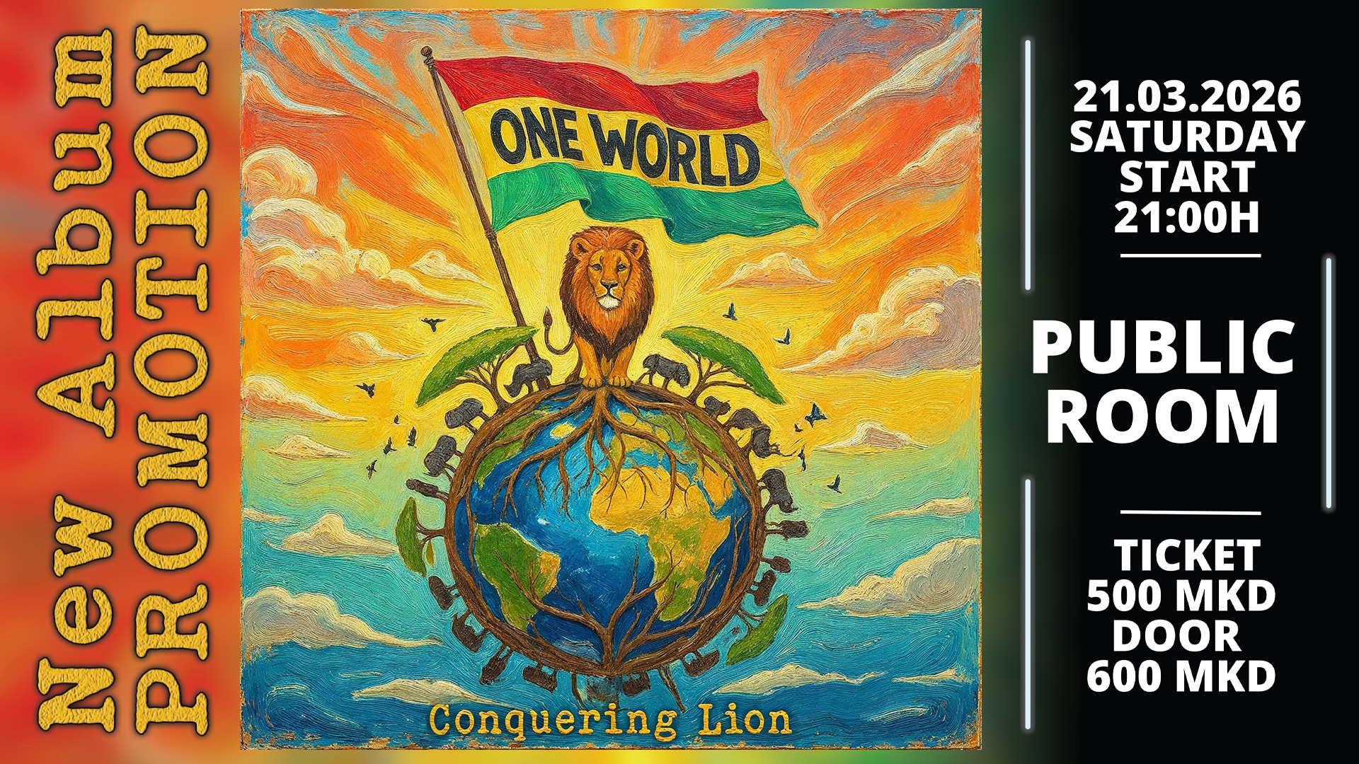 Со огромна чест, Conquering Lion ве поканува на концертна промоција на албумот „One World“, која ќе се одржи во клубот Public Room во Скопје, на 21-ви Март (Сабота), со почеток во 21:00 часот. Влезниците се во претпродажба по цена од 500 денари, достапни само онлајн на Tix.mk.