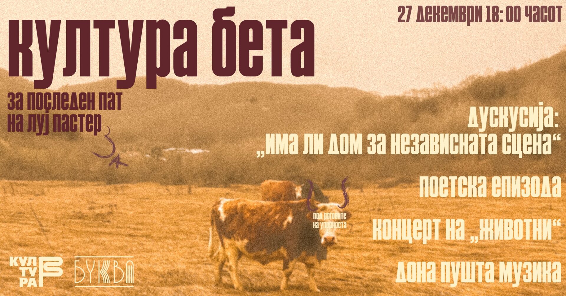 На 27 декември, од 18 часот па сè до фајронт, Култура Бета го организира последниот настан на локацијата Луј Пастер 3А, во кафе-книжарницата „Буква“. Со овој настан симболично се затвора едно важно поглавје – не само за Култура Бета, туку и за независната културна сцена во Скопје.
