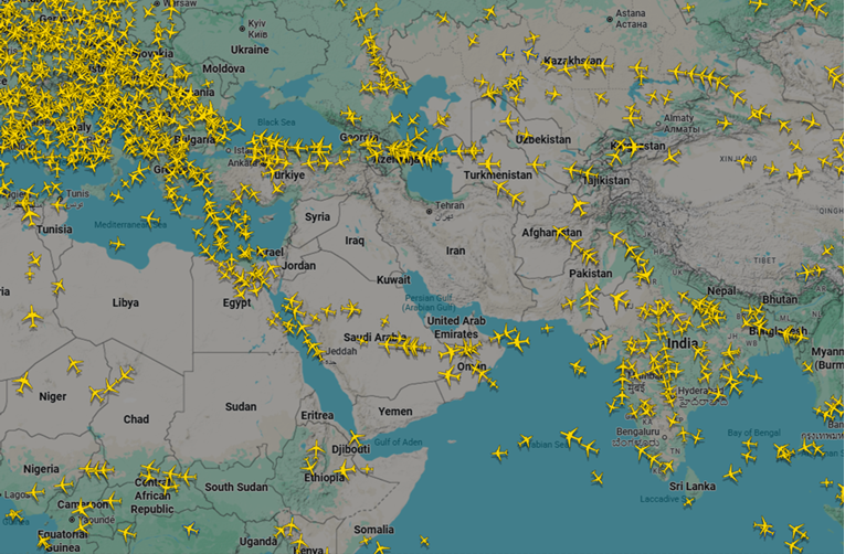 Картата на FlightRadar24 покажа дека главниот воздушен коридор исток–запад над Ирак, инаку една од најпрометните „воздушни автопатишта“ меѓу Азија и Европа, е речиси целосно празен.
