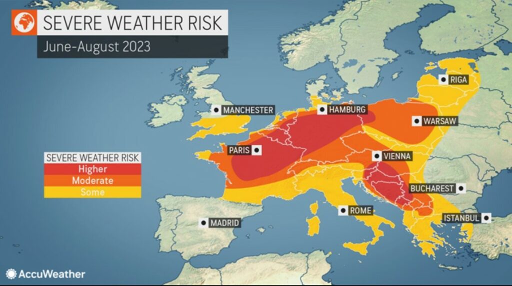 Летната прогноза на AccuWeather за Европа ја истакнува зоната од северна Франција до Германија, Полска и балканските држави како најверојатниот коридор за почести врнежи и можеби дури и тешки временски услови во споредба со остатокот од континентот.