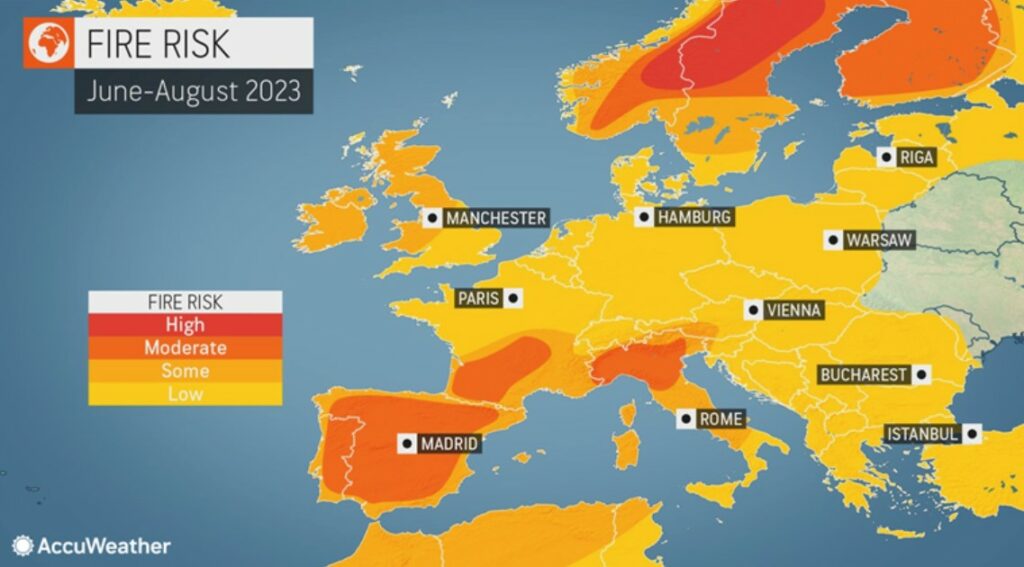 Се очекува летото да биде посуво и потопло, во споредба со историските просеци, во северната половина на континентот, вклучувајќи ги Ирска, Обединетото Кралство и Скандинавија. „Постои ризик од повторување на 2018 година во Скандинавија, кога продолженото топло и суво време предизвика шумски пожари“, рече Ројс, додавајќи дека регионот се бори да се справи со таквите временски услови.