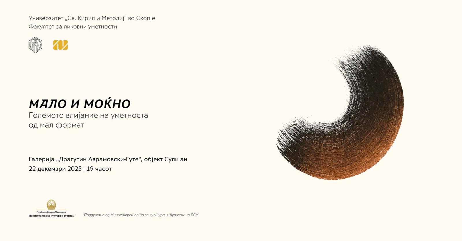Факултетот за ликовни уметности при Универзитетот „Св. Кирил и Методиј” во Скопје ја најавува студентската изложба „Мало и моќно – Големото влијание на уметноста од мал формат”, која свечено ќе биде отворена на 22 декември 2025 година, со почеток во 19:00 часот, во Галеријата „Драгутин Аврамовски-Гуте” во Сули ан.