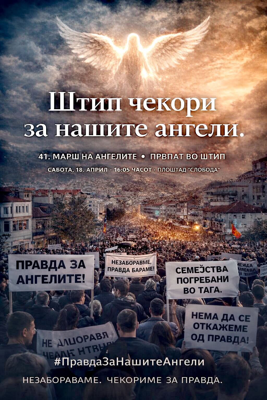 Маршот на ангелите, кој ќе се одржи по 41. пат, оваа сабота за првпат ќе биде организиран во Штип. Од здружението „16 Март“ велат дека со маршот сакаат да оддадат почит на загинатите, да потсетат на болката што семејствата и натаму ја носат и уште еднаш јавно да побараат правда.