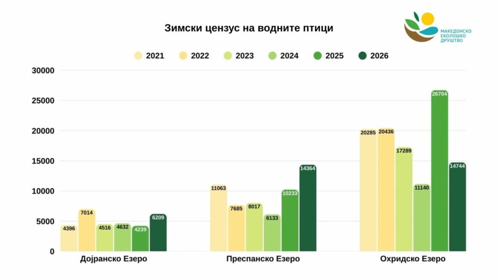 Најновите податоци од зимскиот цензус на водни птици, спроведен во јануари 2026 година под водство на Македонското еколошко друштво (МЕД), повторно го ставаат Охридското Езеро во фокусот на загриженоста за состојбата на неговиот екосистем. Бројот на водни птици годинава изнесува околу 14.000 единки, значително помалку во споредба со минатата година, кога биле изброени над 26.000 птици.