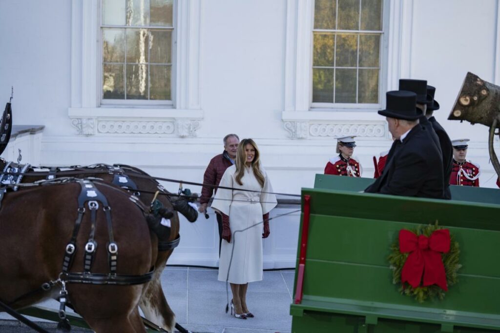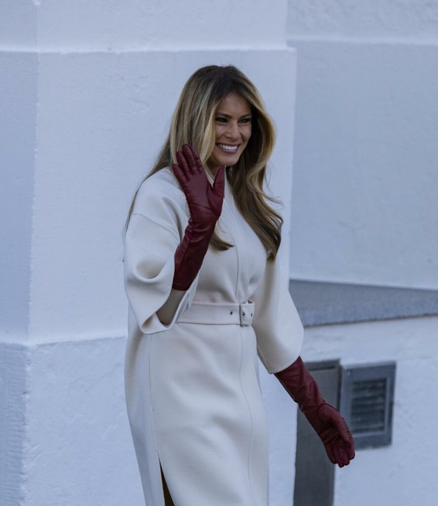 Совршениот изглед на Меланија Трамп е олицетворение на аристократска елеганција и безвременска софистицираност. Првата дама се појави во јавноста облечена во луксузно бело палто, кој нежно го нагласува нејзиниот тен. Палтото е кроено со извонредна прецизност – архитектонските рамена даваат структура и авторитет на силуетата, додека едноставен, суптилен ремен нежно го нагласува нејзиниот тенок струк, балансирајќи ја формалноста и женственоста. Ткаенината на палтото е богата, со мал сјај кој додава текстурална димензија, додека неговиот минималистички крој ѝ овозможува на самата Меланија да блесне како централен фокус.