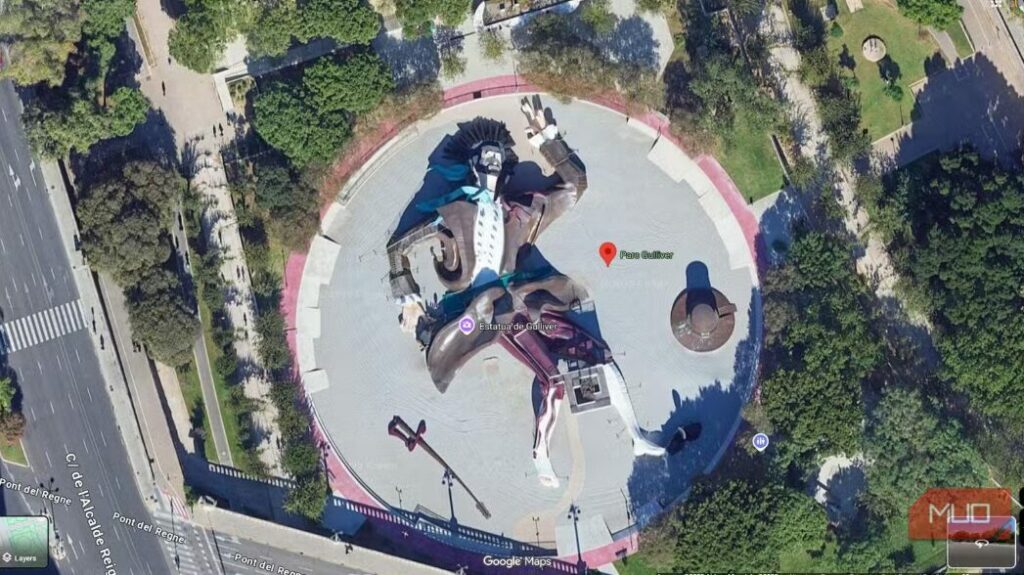 Во Валенсија лежи џиновски Гуливер, долг 70 метри, претворен во детско игралиште. Посетителите можат да се искачуваат по неговата облека, да се лизгаат по рацете и да истражуваат скриени премини во неговата „коса“. Одозгора, на сателитска снимка, изгледа како замрзнат џин меѓу дрвјата.