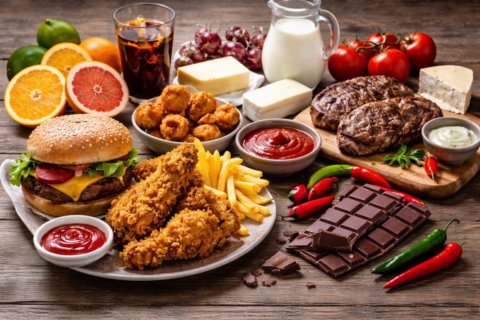 Доматите и производите од домат, како кечап или сосови, исто така се чест тригер.