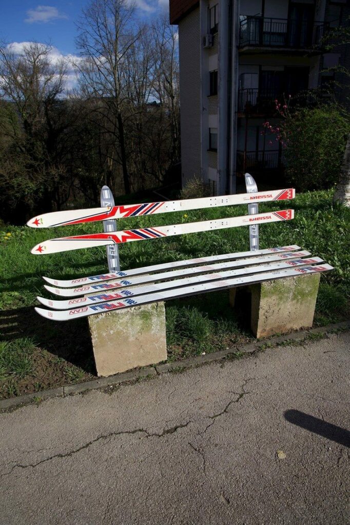 Белата клупа е направена од – скии. Скијачкото седиште е поставено на бетонски столбови, додека потпирачот за грб е целосно направен од скии.