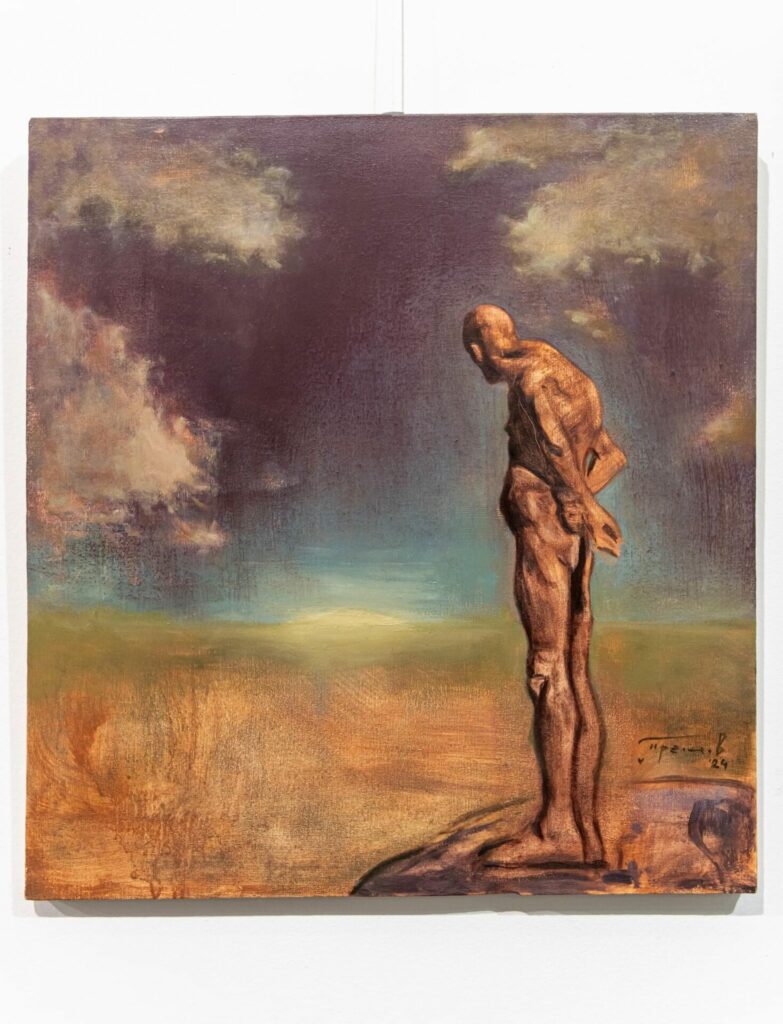 Во неговите дела човекот не е само форма, туку прашање – егзистенцијално, духовно и понекогаш иронично поставено. Наместо да нуди одговори, тој го прикажува моментот: состојба што се доживува, а не се објаснува.
