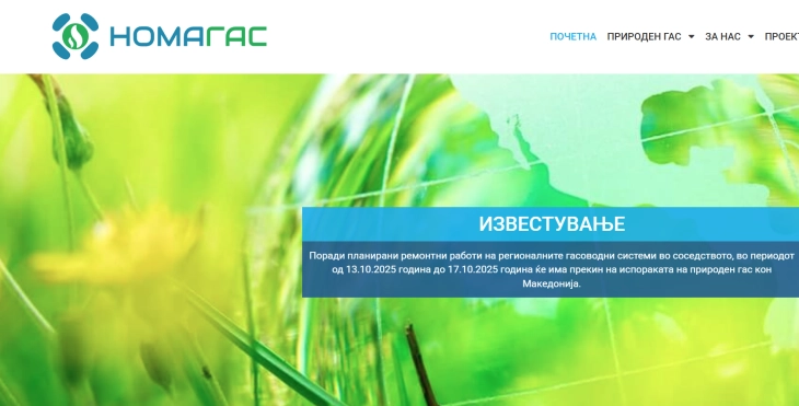 „Поради планирани ремонтни работи на регионалните гасоводни системи во соседството, се соочуваме привремено да има прекин на испораката на природен гас кон Македонија, а ваквите ремонтни активности не се во ингеренции на НОМАГАС АД Скопје од причини што не се вршат на сопствениот гасовод. Имајќи го во предвид наведеното, активно и ажурно се следи состојбата 24 часа на ден и во рамките на расположлилвите можности се превземаат сите неопходни мерки за соодветно да се постапи и да се избегнат негативните страни на прекинот колку што е можно повеќе.Согласно досегашните информации кои ги имаме, ремонтните работи треба да завршат на време и веќе утре на 17 октомври треба да се стабилизира испораката на природен гас. Доколку добиеме известување за евентуални пролонгирања, дополнително ќе Ве известиме“, се вели во соопштението од НОМАГАС АД.