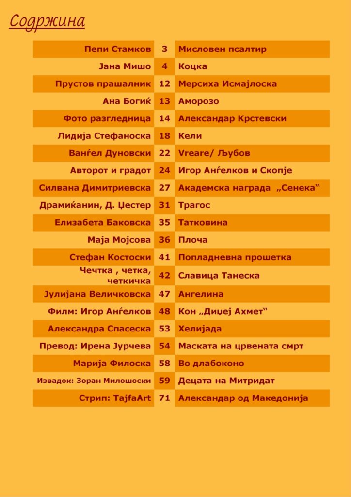 Во најновиот број читателите ќе најдат оригинални литературни текстови од млади и веќе афирмирани автори, критички осврти, книжевни рецензии и визуелни прилози што отвораат нови перспективи за разбирање на современата уметност.