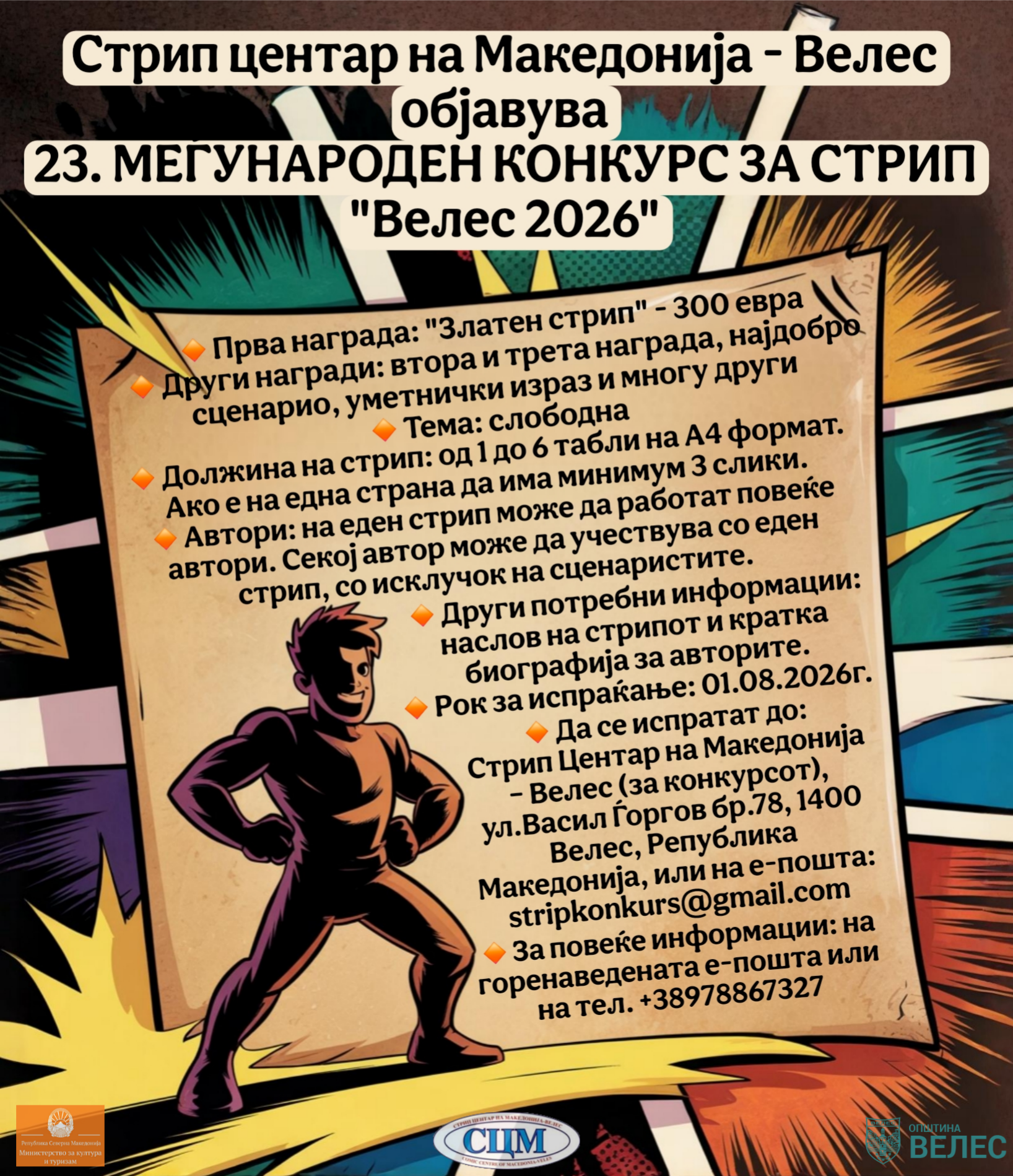 Овој конкурс е составен дел од активностите од традиционалниот 23 Мегународен стрип салон “ Велес 2026‘-најзначајна стрип манифестација во државата. Истиот е финансиран од страна на Министерството за култура на Република Северна Македонија и Општина Велес .