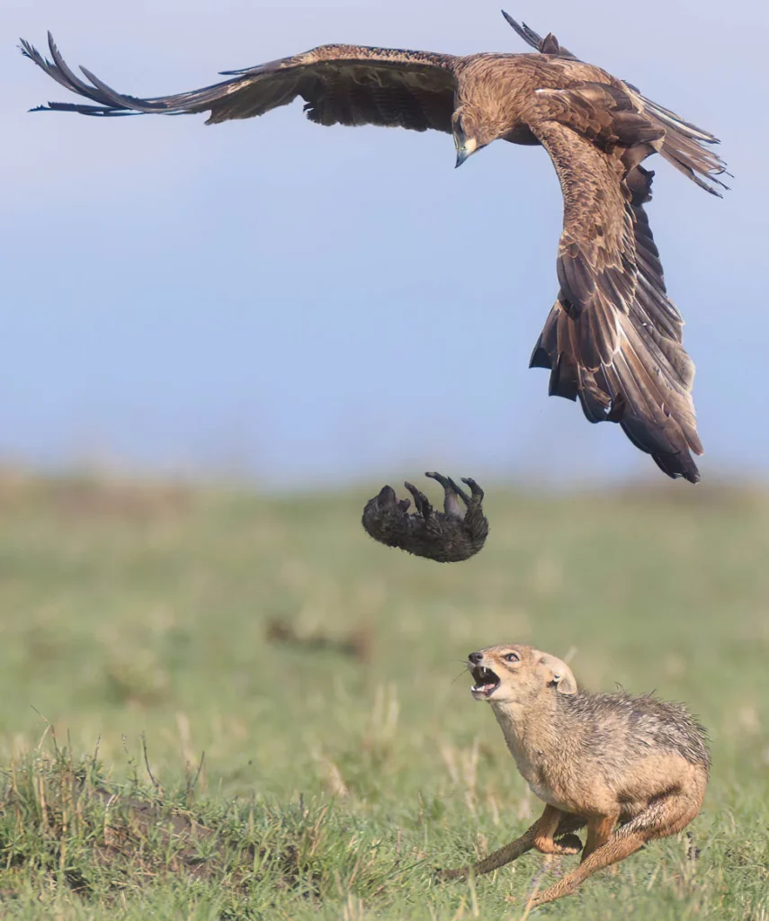 „Голема драма на рамнините во Масаи Мара“, пишува Хусаин за кадарот. „Мајката шакал некако успева да го притисне доволно кафеавиот орел за да го испушти младенчето, само неколку моменти откако успеа да го грабне шакалот под носот на мајката“.