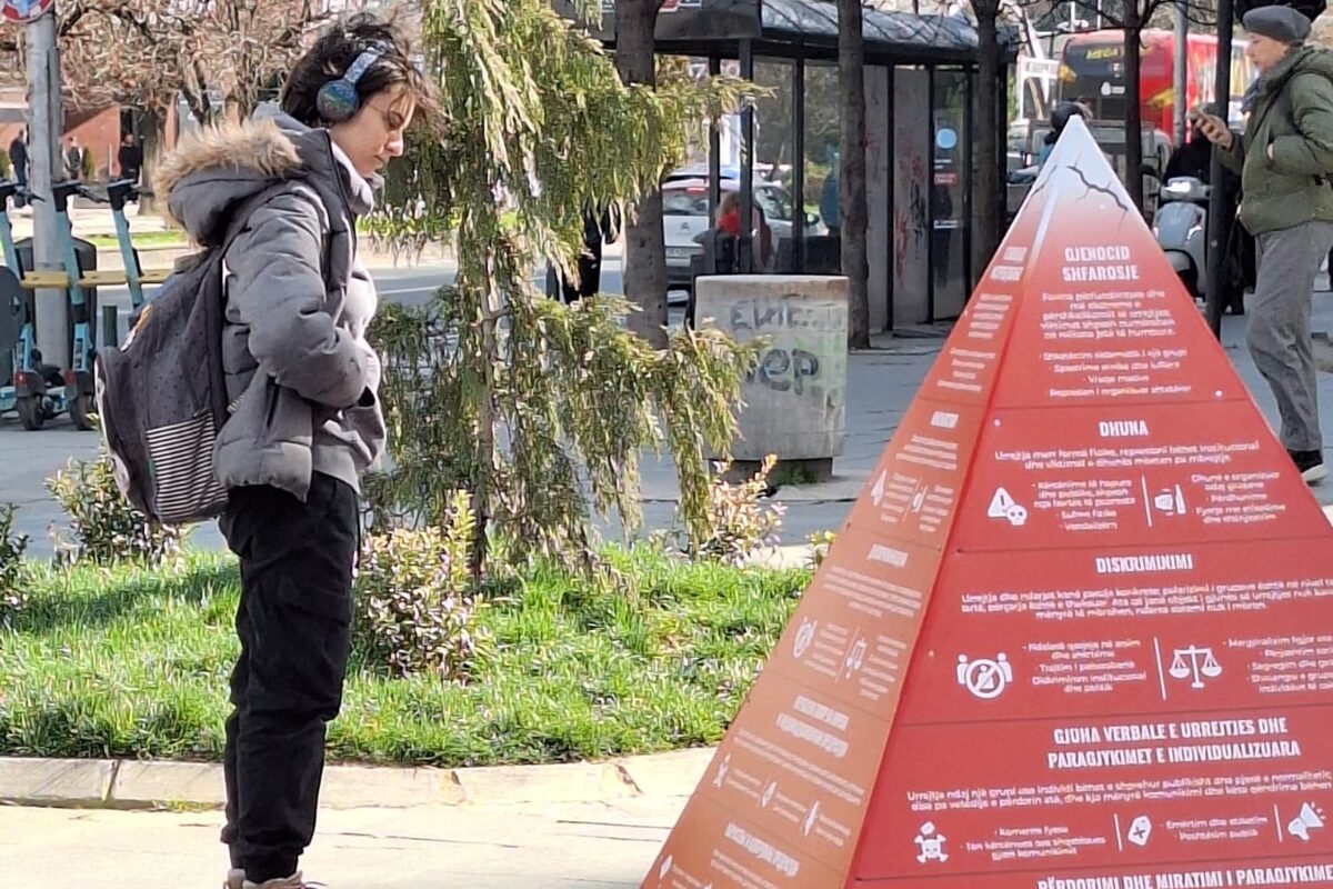 „Пирамидата на говорот на омраза“ поставена на скверот кај Ким на булеварот Партизански одреди е визуелна и едукативна структура која го прикажува постепеното ескалирање на омразата во едно општество, од навидум „невини“ предрасуди до најекстремните форми на насилство и истребување.
