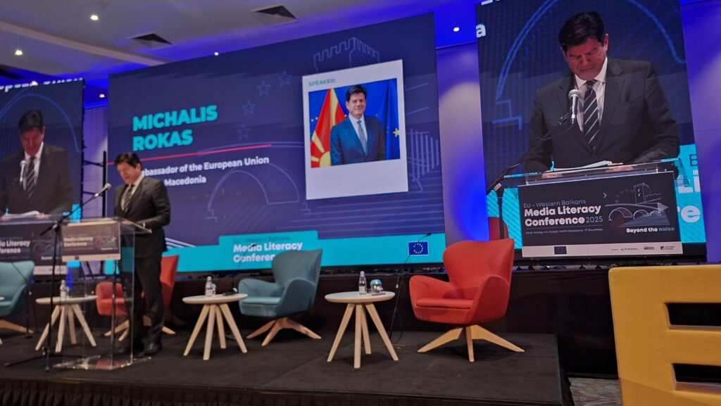 „Медиумската писменост е една од најсилните алатки што ги имаме за да ги заштитиме општествата. Кога луѓето можат да препознаат лажна содржина, да ги преиспитаат содржините кои ги сретнуваат на интернет и да бараат доверливи информации, тие стануваат активни чувари на демократијата. Ова, меѓу другото, е и една од причините зад „Европскиот штит за демократија“, иницијатива на ЕУ која ја зајакнува нашата заедничка подготвеност да се спротивставиме на манипулативни информации и да изградиме колективна отпорност, потенцираше амбасадорот Рокас.
