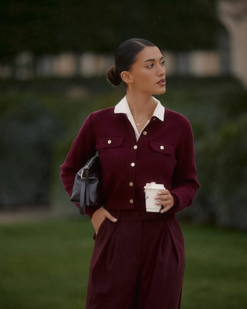 За разлика од црната и морнарско сината, кои со децении беа безбедни избори, бордото палто внесува софистициран пресврт во гардеробата. Неговата длабока, богата боја се вклопува подеднакво добро со класични тонови и неочекувани нијанси, што го прави идеално парче за секоја пригода, од деловни комбинации до формални вечери.