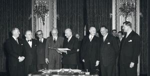 На 18 април 1951 година, шест земји го потпишале Договорот за Европската заедница за јаглен и челик во Париз: Франција, Западна Германија, Италија, Белгија, Холандија и Луксембург. Стапил во сила на 23 јули 1952 година.