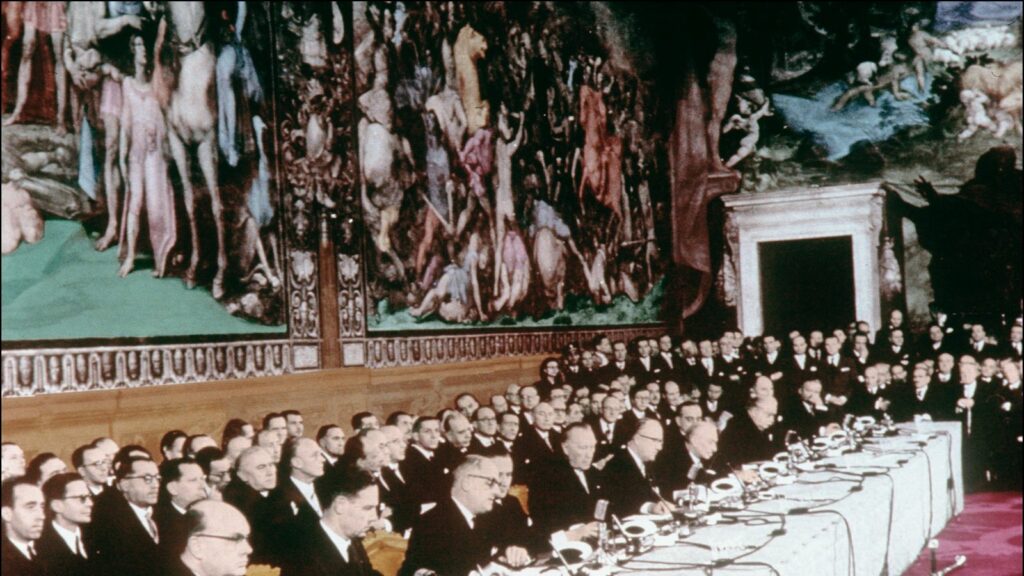 На 18 април 1951 година, шест европски земји го потпишале Парискиот договор и го создале првото заедничко наднационално тело во историјата на континентот. Три војни за помалку од еден век, разурнати градови и генерации задоени со омраза претходеле на таа одлука. Седумдесет и пет години подоцна, духот на таа одлука сè уште го одредува начинот на кој Европа носи закони, ги штити граѓаните и одговара на кризите.