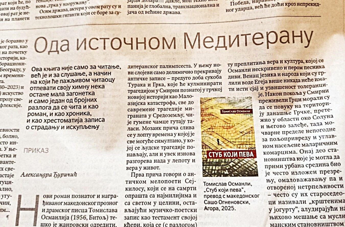 Во најновиот број на прилогот „Култура, уметност и наука“, белградскиот дневен весник Политика објави нов осврт кон српското издание на романот Столб што пее од македонскиот писател Томислав Османли, под наслов „Ода кон источниот Медитеран“. Романот неодамна беше објавен во Србија од новосадскота издавачка куќа Агора, во превод на писателот и преведувач Сашо Огненовски.