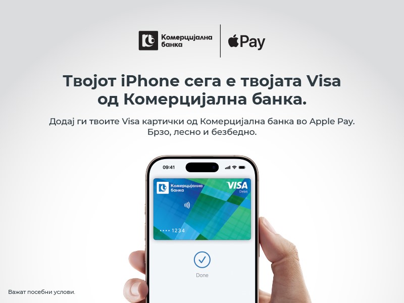Со овозможувањето на Apple Pay, Комерцијална банка повторно се потврдува како партнер на твоето модерно секојдневие. Со твоите картички од Комерцијална банка и со Apple Pay секојдневното плаќање станува ново искуство во кое едноставноста, практичноста, сигурноста и стилот одат заедно. А во светот што не чека твоето секојдневие се движи беспрекорно во твој ритам.
