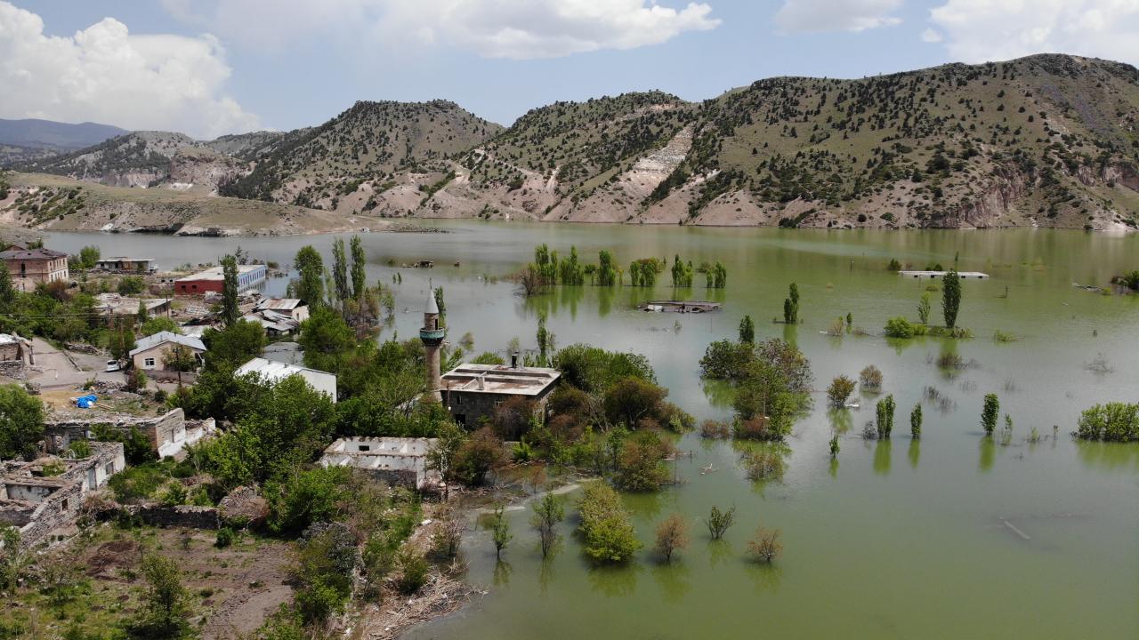 Речиси целосно зачувани згради од село потопено во 2020 година повторно излегоа на површината по повлекувањето на водата во акумулацијата Каракурт во источниот турски округ Карс, јави Анадолија, споделувајќи снимки од местото.