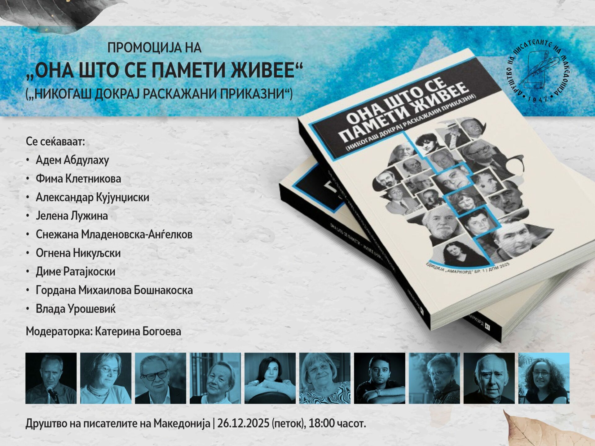 Во просториите на Друштвото на писателите на Македонија, на 26 декември 2025 година, со почеток во 18:00 часот, ќе биде промовирана книгата Она што се памети живее (со поднаслов „Никогаш докрај раскажани приказни“) – збирка раскази посветена на споменот на автори, поети и писатели, поранешни членови на ДПМ, чие творештво оставило трајна вредност во македонската култура.