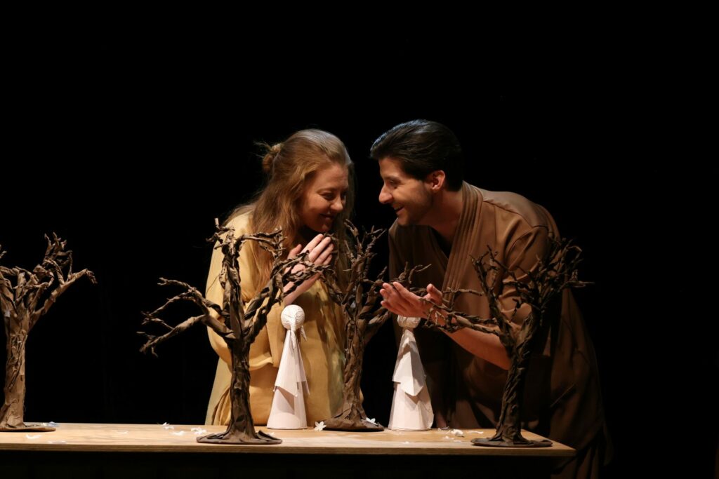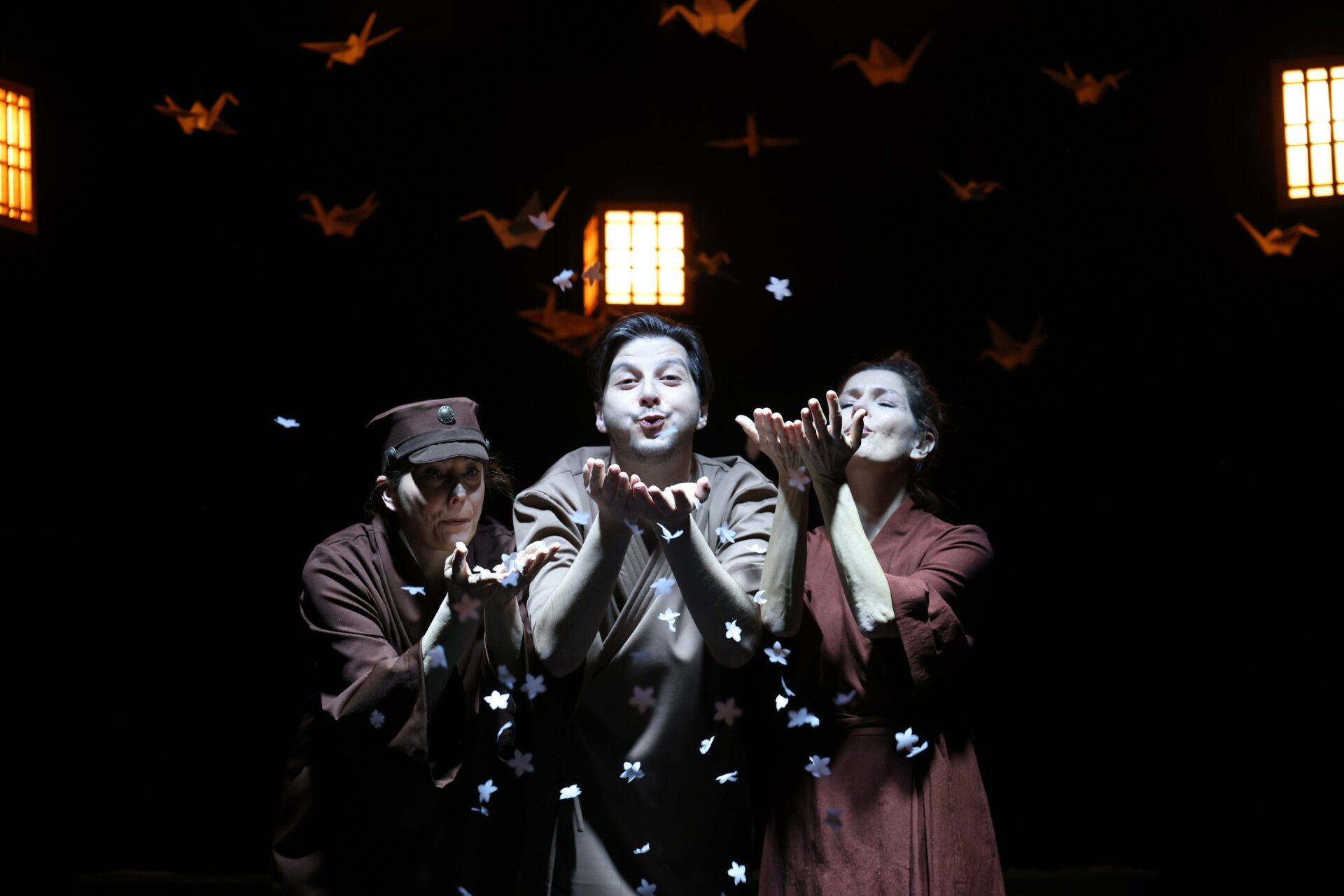 Во претставата настапуваат: Анастасија Ласовска во улогата на Садако, Никола Наковски како Шигео, Ана Левајковиќ-Бошков во улогата на мајката, Катарина Илиевска-Силјановска како таткото, Изабела Новотни во улогата на бабата и Марија Ѓорѓијовска во улогите Господин Војна / Госпоѓа Леукемија.